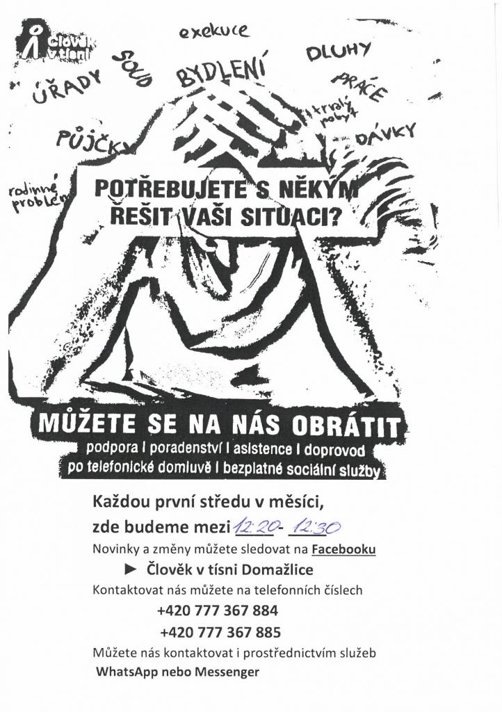 Sociální pracovnice Člověka v tísni o.p.s. budou v Meclově pro své klienty každou první středu v měsíci na parkovišti před hasičskou zbrojnicí v Meclově (od 12:20 do 12:30 hodin). Kontaktovat můžete také Kristýnu Štrúbelovou, soc. pracovnici – tel. 777367884, email: kristyna.strubelova@clovekvtisni.