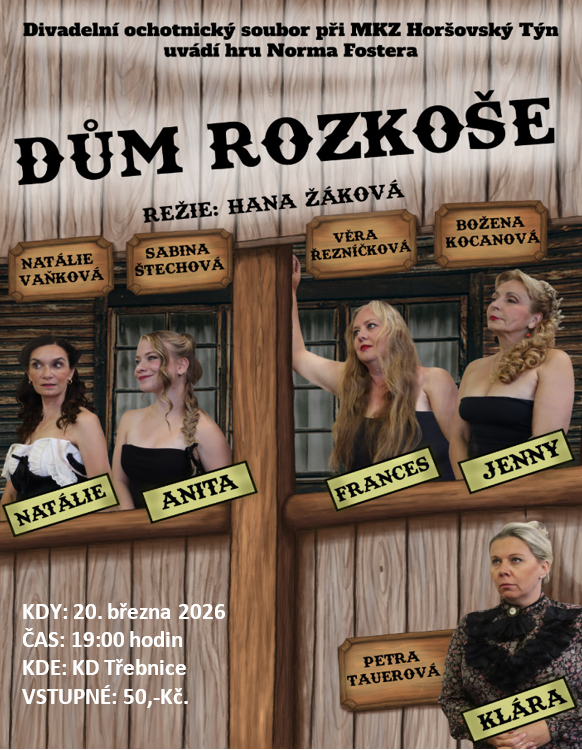 Obec Meclov ve spolupráci s SDH Třebnice Vás srdečně zve v pátek 20. března 2026 od 19:00 hodin do Kulturního domu v Třebnicích. Ochotnický soubor k nám přijede s nevídanou komedií „DŮM ROZKOŠE“ od kanadského autora Norma Fostera. Tento příběh plný smíchu i dojetí Vás na chvíli přenese až do malého kansaského městečka, kde zjišťujeme, že i v domě se špatnou pověstí panuje přátelství, ale především touha po samostatnosti a nezávislosti.